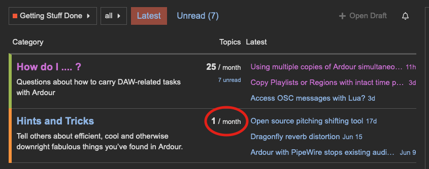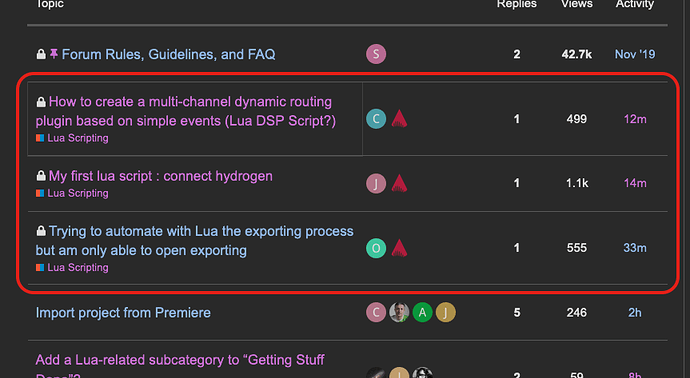 If one of you moderators would create a third subcategory likely just under “Getting Stuff Done” called ‘Lua Scripts / Scripting’ or ‘Using Lua’ (-or whatever you would feel is appropriate), as a “Regular” on this site (-with post re-categorizing privileges) I would be more than happy to spend some of my time going through old posts, re-categorizing Lua-related ones accordingly into the new subcategory.