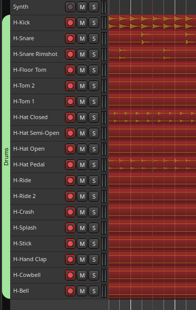 I use Hydrogen for drums because I like working in quantized time. I need to get Hydrogen’s output into Ardour, and I may at some point want to do something like throw a compressor on the kick, so I decided to route each instrument into its own channel. The channels are in a group, so it’s easy to set them all to record or mute or whatever at once. I can go into the mixer and put effects on individual channels as I like. Great so far.