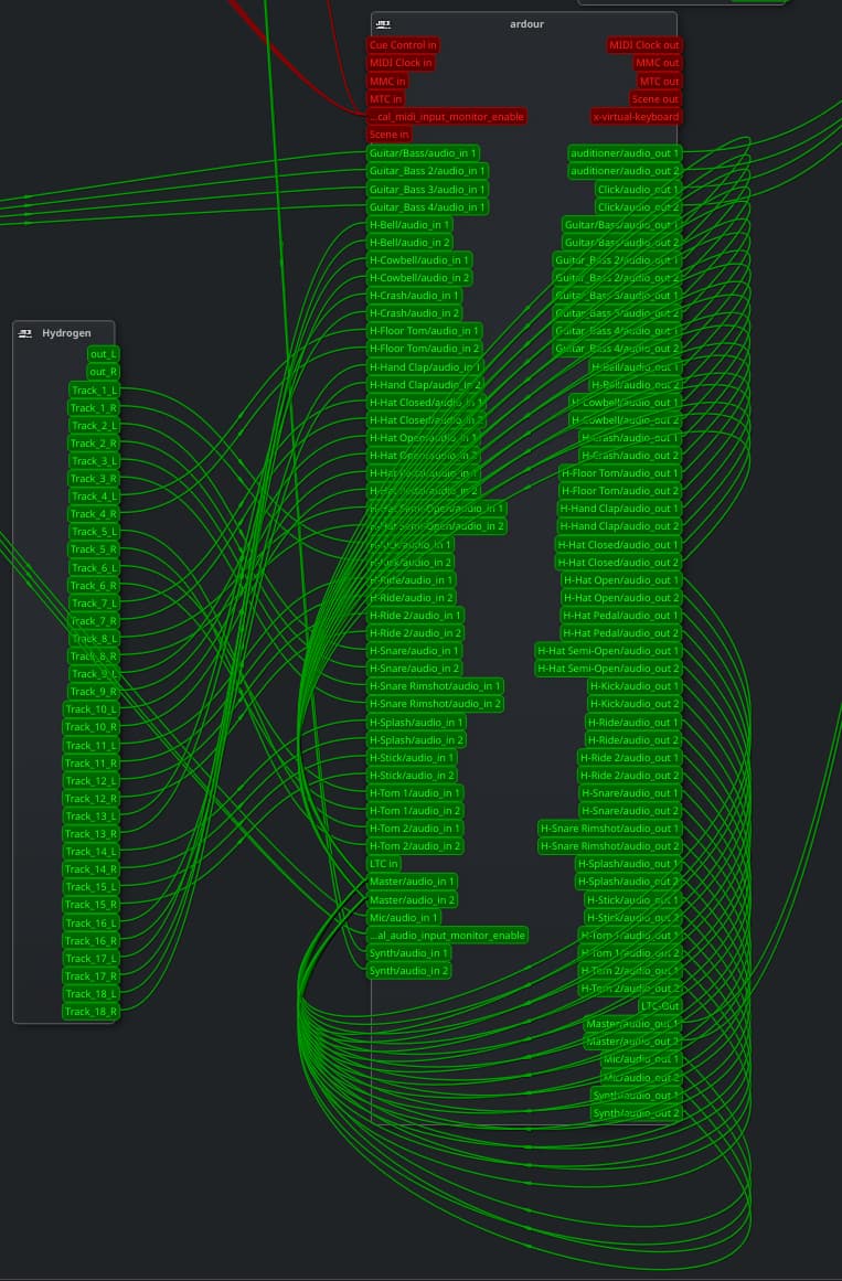 Sure. We do sometimes add specific cymbal mics, but for the sake of the OP’s request, I did not want to complicate things. I personally don’t do studio work but for our rehearsals, depending on what we are tracking, we may add these specifics mics or not. And yes, for the overheads (which we always use), we make sure to use matched pairs of mics. This said, the main point for the OP is to design a sane routing between Hydrogen and Ardour. One of the first things he could try is to group things better. I also don’t understand why all tracks are stereo when they needn’t be.