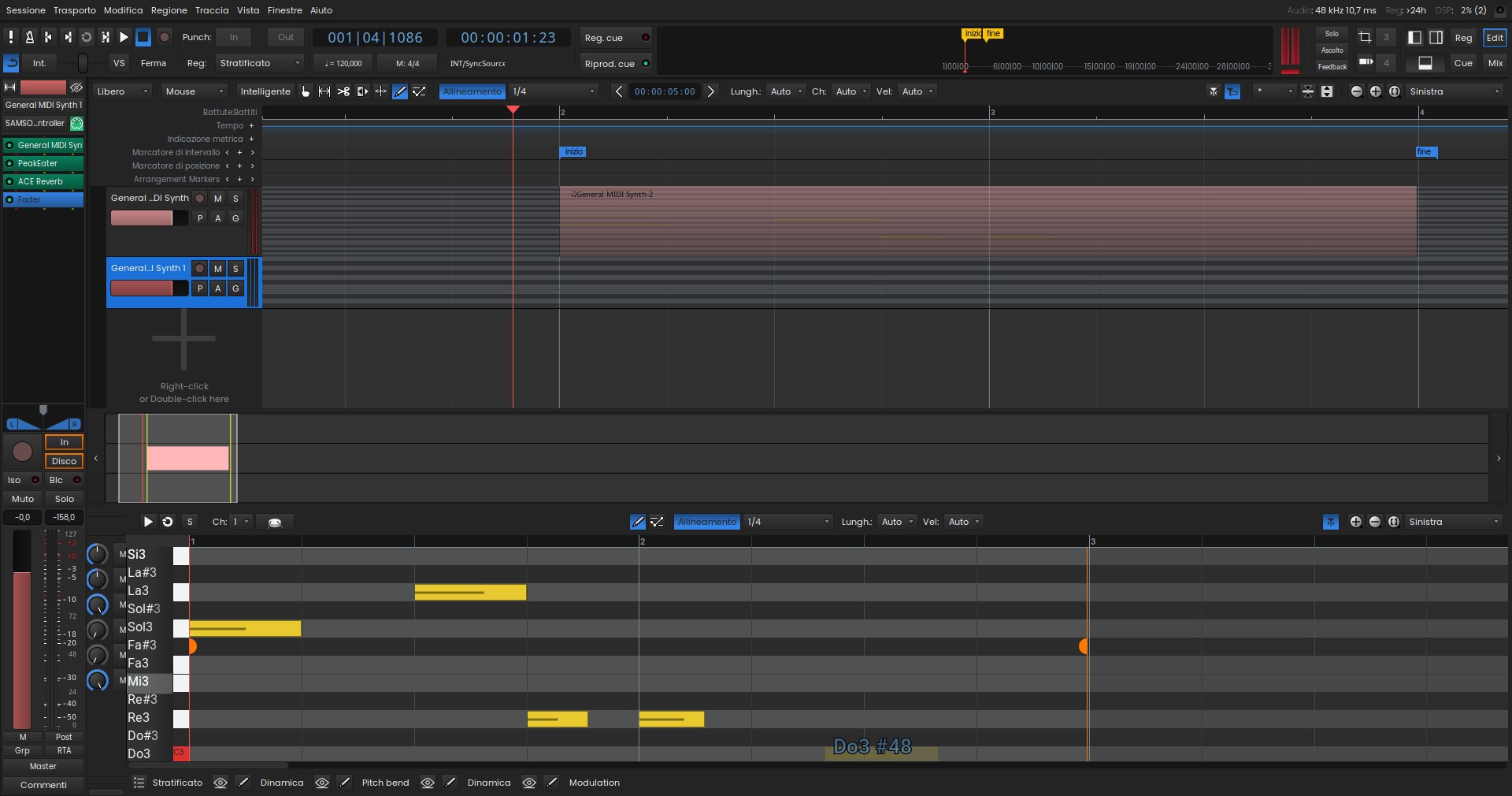 Hi guys, first of all,thank you for Ardour 9 ! Now, not sure if is a bug/feature or I miss something but: Added midi track, one small region and few plugins. Fine, I see all plugins in the bottom panel and if I click on the region, I see the new piano roll. Added another track with few plugins but the bottom panel still show the piano roll with the ragion from first track. There is a very small area on the left of the piano roll where I can see the plugins but something seems wrong.