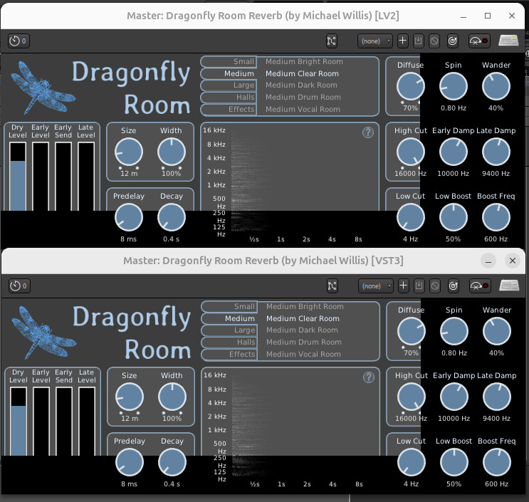 The Dragonfly line of reverbs (VST3 and LV2) look like this on Ardour 9.