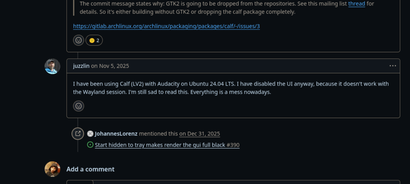 Clean (because CALF does its job): CALF ports itself to gtk3, which there are talks on the repo, talks of a ctk, which will take a lot of time, then applying ctk which will take even more time. Knowing GIMP’s fiasco with their port, this will take a long long long time. There are discussions of using AI to do this - due to copyright and quality issues (license cannot be applied to AI generated sections), I did advise them against that.