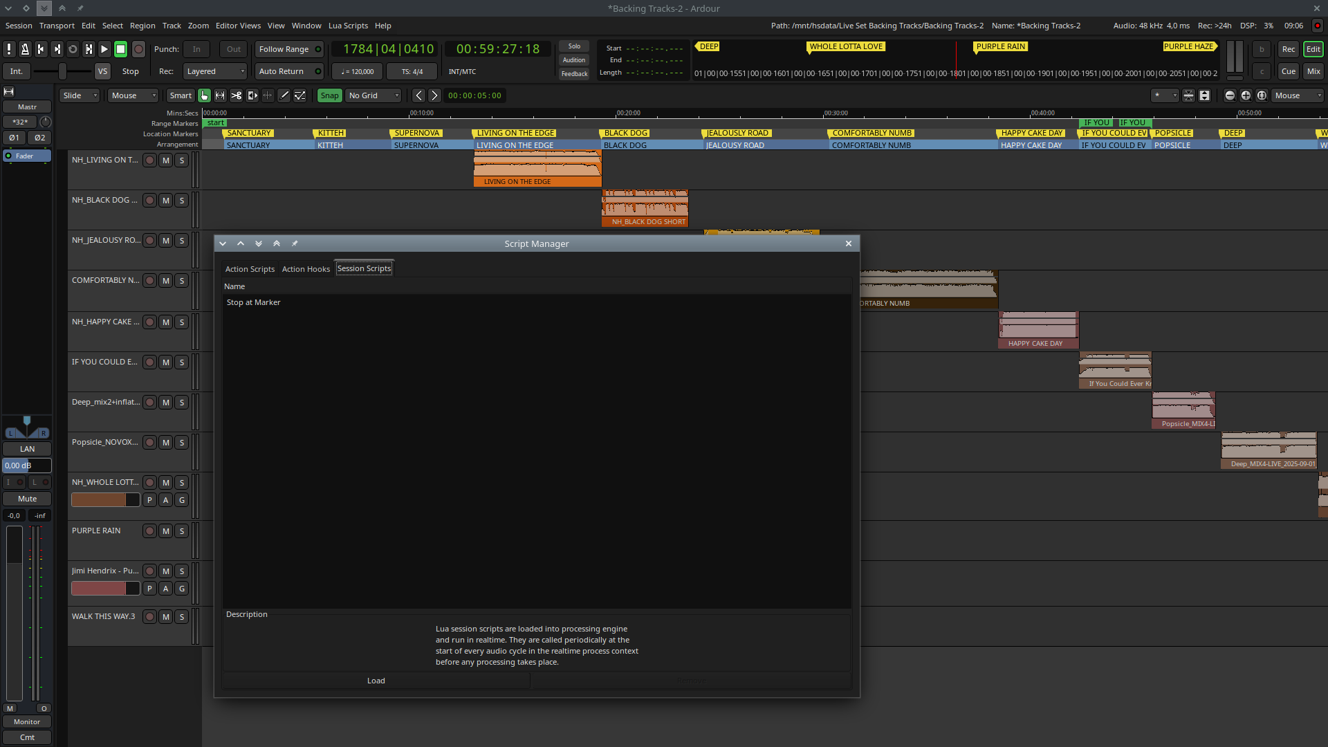 What might be the best way to use Ardour for live performances? I love Ardour, and it fits the bill nicely for playing back pre-recorded tracks and sending out MIDI commands, but I would either need to open the next song session for every song change, or create one long (an hour or more) session, with auto-return off and tempo changes inserted. Which I’m not opposed to. Just looking for advice on the best way to do this. I’m open to trying other software, but I’m comfortable with Ardour and it does exactly what I need it to do for each song in a performance.