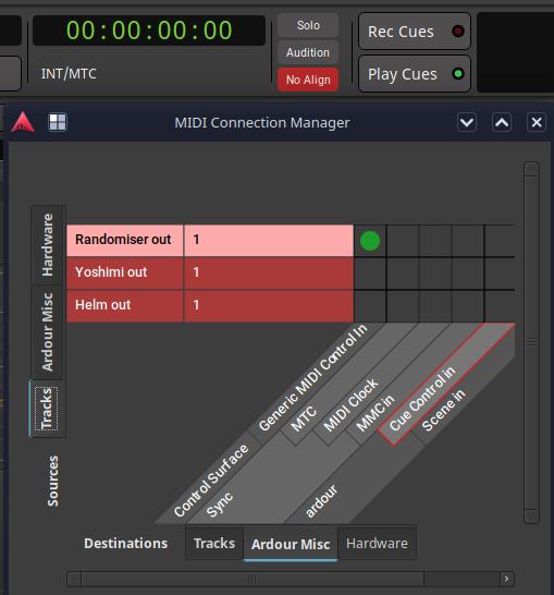 In this topic I tried to send CC from one track to another. Just setting the MIDI output to another track’s MIDI input doesn’t work*. I tried to connect a track’s output to the MIDI control in channel via the midi connections manager but this doesn’t work with MIDI Learn* and it pops up the No Align light. I don’t know whether that is supposed to work or maybe the ability to make that selection shouldn’t be there?
