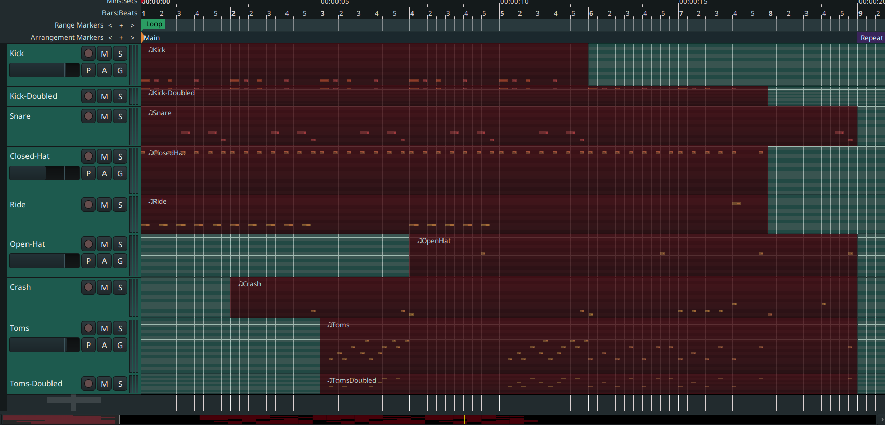 when you are satisfied with your rhythm, record all the single drum tracks together in a new MIDI track