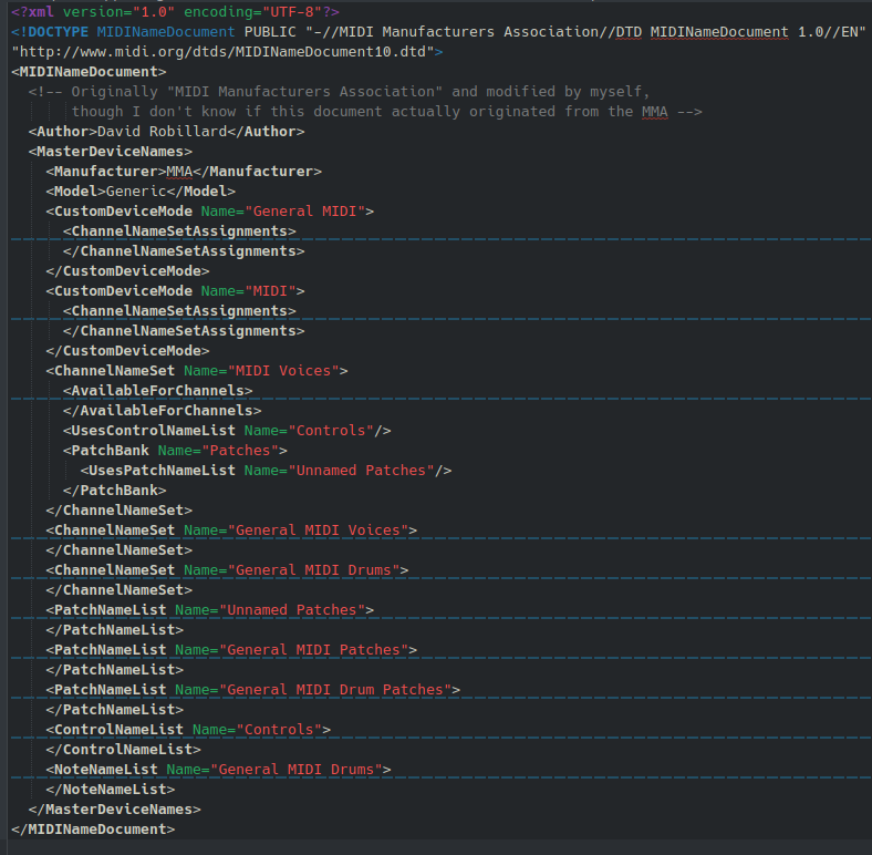 In the case for the MIDI.midnam it contains multiple NameSets. Where the PatchBanks within the different NameSets call out to standalone PatchNameLists outside the ChannelNameSet scope.