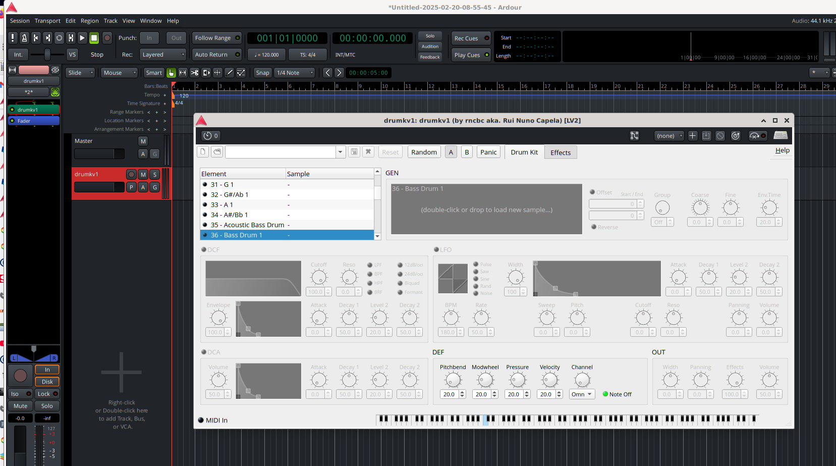 drumkv1 LV2 GUI shows well here too in Ardour 8.11. This is on openSUSE Tumbleweed, distro packages from GeekosDaw project. The plugin is compiled against Qt 6.8 and linked statically.