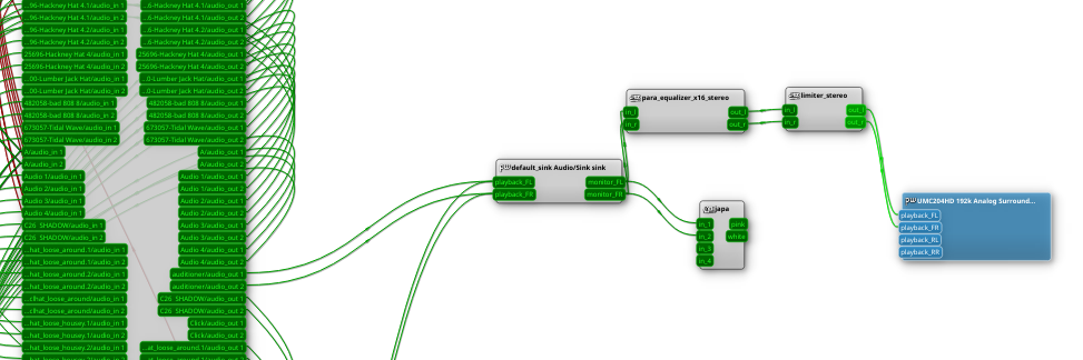 I connect Ardour 8.7 to a default sink which goes then through a limiter and an EQ. When that default sink is also connected to JAPA, Ardour complains and the Feedback LED (Mehrdeutig) is blinking. When I disconnect the connection to JAPA it stops.