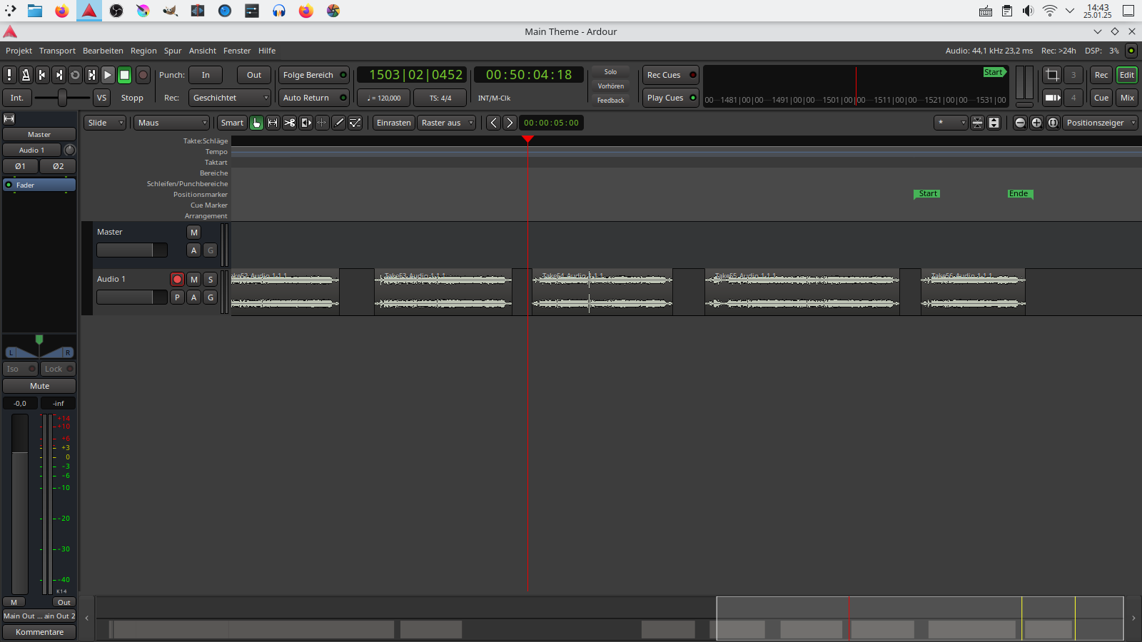 To get started, I looked at this quick guide from unfa on YouTube. So, I know how to make recordings with Ardour and have done so several times already. The results are satisfying. I even got rid of the side noise by adjusting the gain knobs on the audio interface.