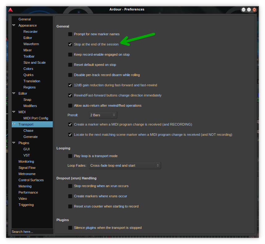 I was working on a track this morning, and i must have accidentally left it in playback. I just came back home to find Ardour still playing at an absurd length of the song, in the hundreds of minutes. How can i make it so that playback stops at the “End” marker?