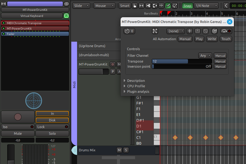 Oh, and I’m not using any of the MT drum clips. I’m doing my own drum composing in Ardour because it’s a great MIDI editor and then I take my tracks over into my primary DAW on a different computer. But every time I make a finished track, I have to select the entire C2 line (and any other notes that are off) and drag it down to C1 on my music system.