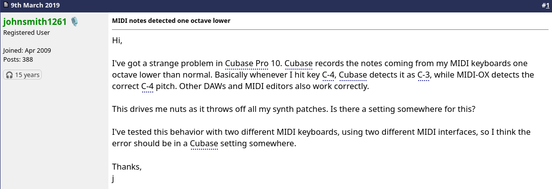 This user also apparently felt that it was important for Cubase to say “C4” since that was what his keyboard said it was sending. In reality, it makes no difference - it’s the same note number with two different names.