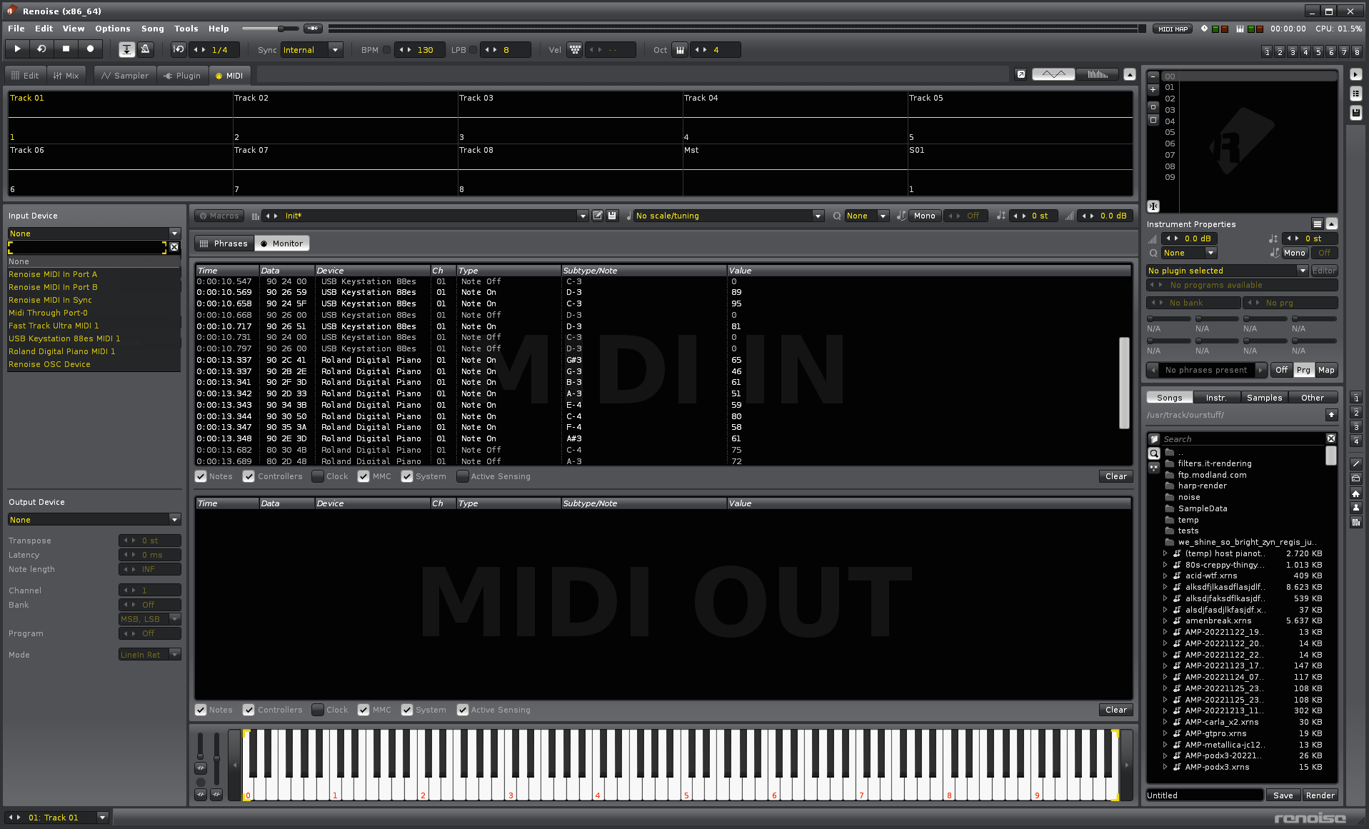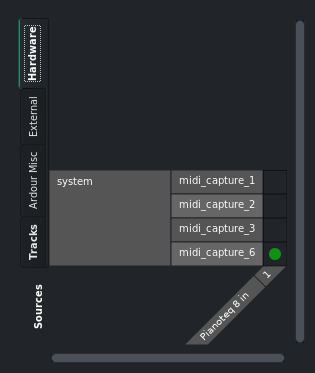 Keyboards/controllers etc. all show up in the track input grids under “hardware” (sideways tab) as midi_capture_1, midi_capture_2 and so on.