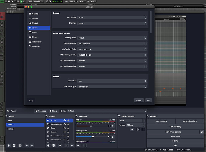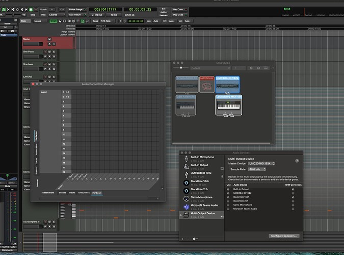 I have been trying to figure out how to capture my midi audio in OBS. I am using a UMC204HD as my audio monitoring and microphone input, I think it may be also handling the sound output of my computer. The problem is, even though I can hear the midi sounds in my headphones, the audio is not being captured along with the regular desktop audio (which is working fine). Im wondering if ardour is somehow isolated from the desktop audio and trying to figure out how to connect it. I was using blackhole 16ch. please see screenshot, any help would be appreciated.