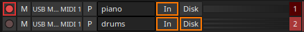 So let’s say I have two MIDI tracks that are both connected to the input of the same MIDI keyboard, and I am in the “Auto Input” mode (well, you know, both “In” and “Disk” buttons with orange borders; can’t upload a second image due to new user restrictions).