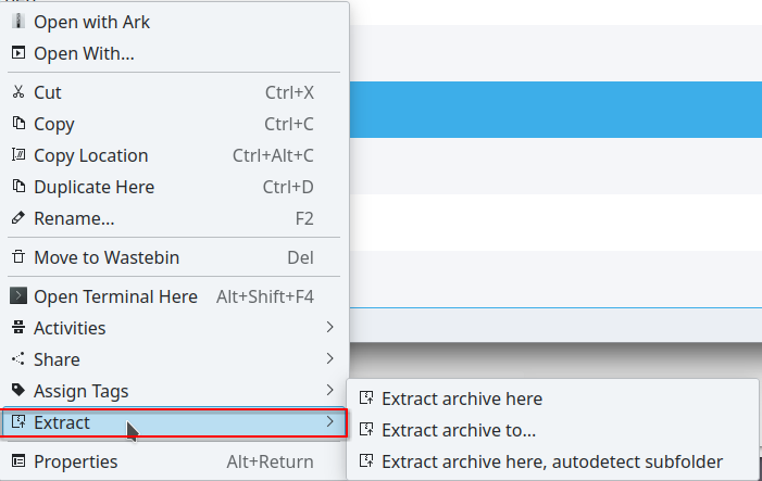 Within Dolphiin, in your download folder, you should see the zip file. If you right-click on that, it should give you a menu with various options for the file. One of those should be extract. Hover over this and you should get additional options, as shown below: