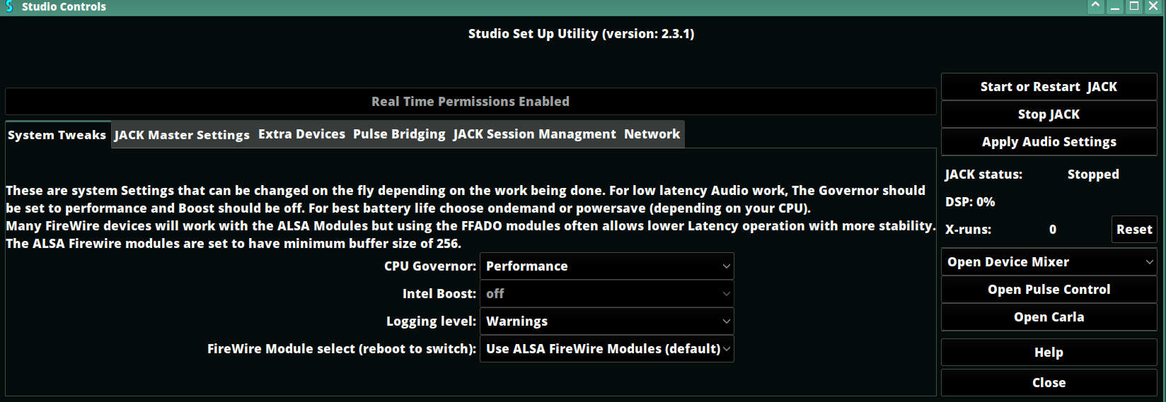 Ubuntustudio comes with a program called studio controls, which I only use to adjust the CPU governor to performance, I don’t change anything else because it is very easy to ruin the sound of the system without knowing where you have screwed up, for me it is like going back in time than having to deal with qjackctl, it’s fun, useful but not out of the box.