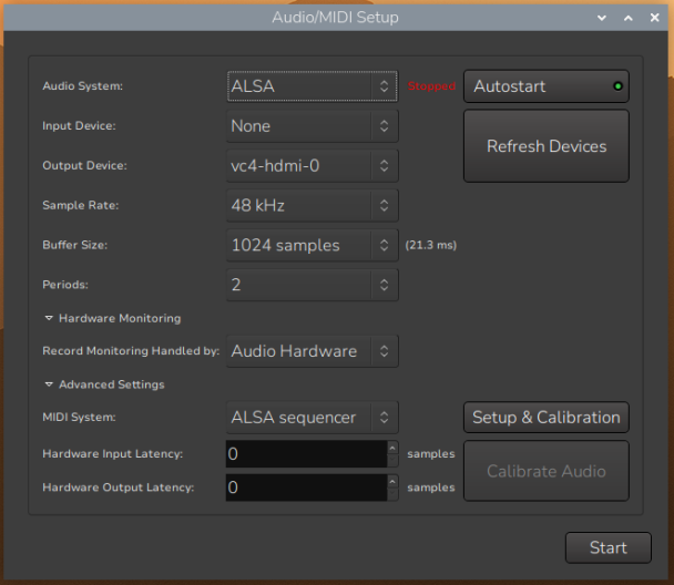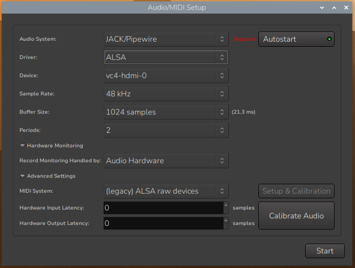 Pisound HAT by blokaslabs is another excellent choice that also comes with physical MIDI I/O ports, and a preconfigured RPIOS “spin” running JACK as a system service, called PatchboxOS.