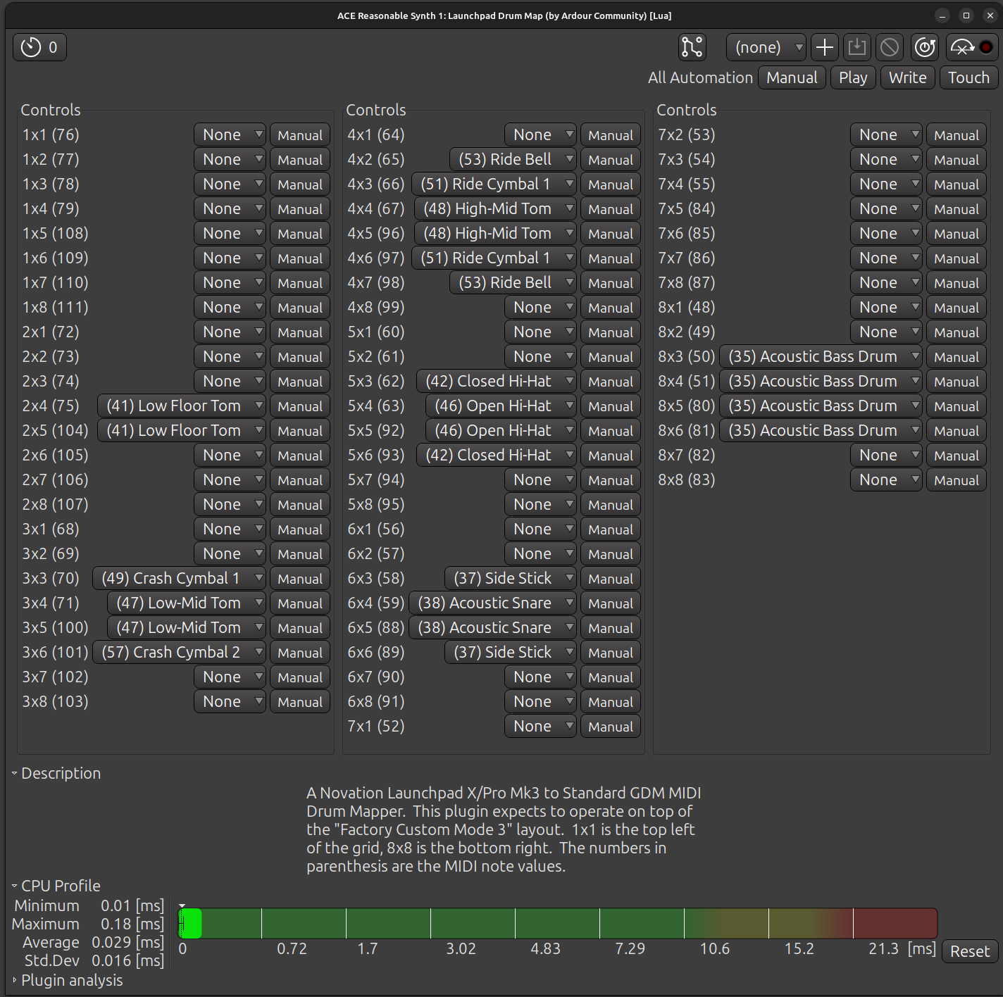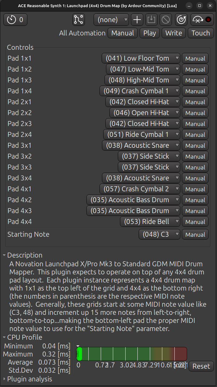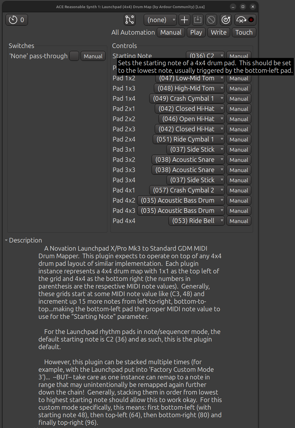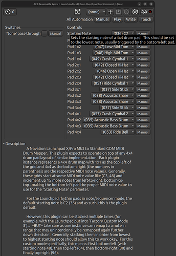 description = [[ A Novation Launchpad X/Pro Mk3 to Standard GDM MIDI Drum Mapper. This plugin expects to operate on top of any 4x4 drum pad layout of similar implementation. Each plugin instance represents a 4x4 drum map with 1x1 as the top left of the grid and 4x4 as the bottom right (the numbers in parenthesis are the respective MIDI note values). Generally, these grids start at some MIDI note value like (C3, 48) and increment up 15 more notes from left-to-right, bottom-to-top...making the bottom-left pad the proper MIDI note value to use for the "Starting Note" parameter.