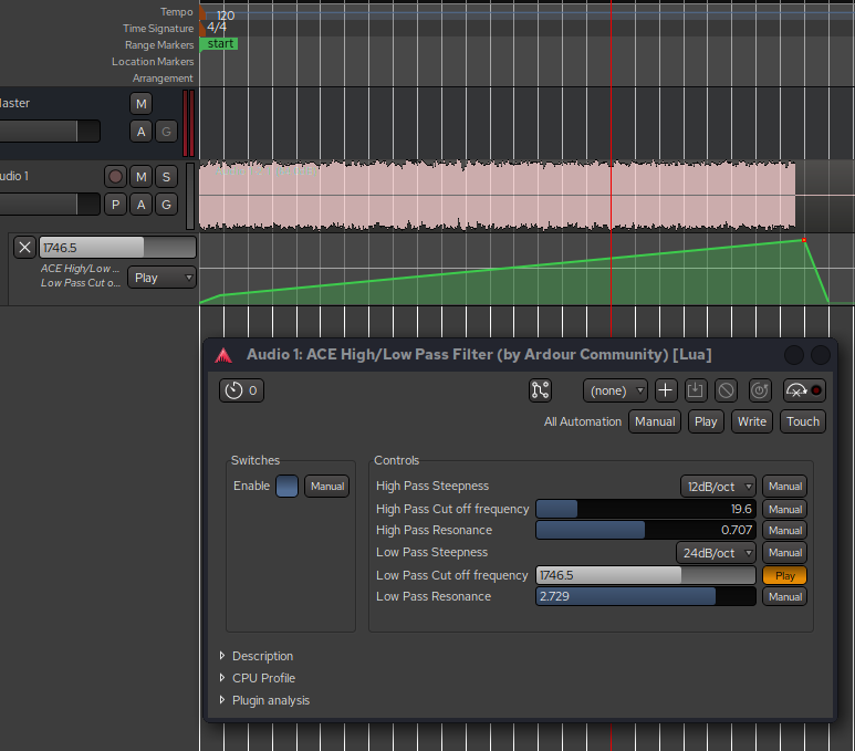 Using LSP x16 parametric plugin, I automated filter 0 frequency in hi-pass mode to cut the lows, then also automated filter 7 as a low shelf to enhance the highs, at the same time also automated filter 7 gain which meant the volume did not disappear when going up the curve… Was able to get all sorts of sweeps up and down the frequency range without losing any of the more complex dynamics… Going to have a lot of fun playing with this!!