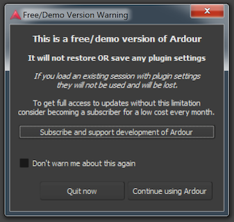While it’s not nice that “Ardour the free/demo version” does not load/save plugin settings, what’s wrong with that? It’s a demo and it says so in multiple places. As you said, it can’t “be considered usable” because, well, as demo, it’s for demonstration and testing purposes only.