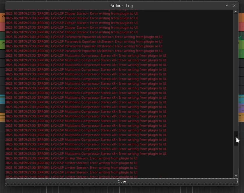 After the update I’m getting a lot of those “Error writing from plugin to UI”. They do not interfere with sound nor cause xruns, but Ardour keeps sending allerts.