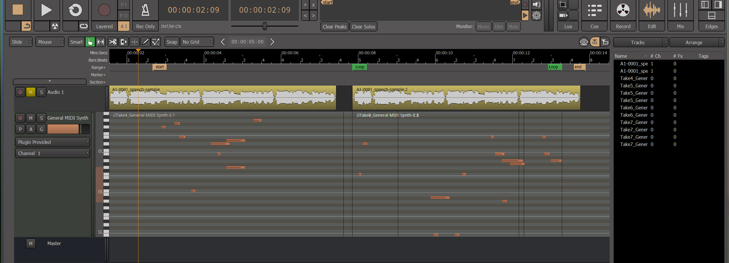 At first I concluded that it was all just a bit cr*p but this morning something happened which got me wondering… I’d rebuilt Mixbus from yesterday’s git and when I loaded the above session, the midi background colour was black and some of the clips were drawn bold while others were at half brightness. And I suddenly realised that the clips I could hear were the bold ones -so presumably the others were in some non-playable state?