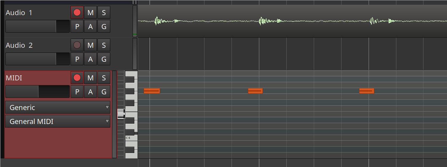 This is me playing along with the click track, playing a single drum sound on the beat. The audio track you see is a microphone recording me banging the key on the MIDI keyboard.