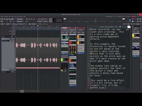 Before describing how it all works, here is a quick demo video of constructing a multiband delay and controlling it with Morph plugins. An original signal (simple guitar chords, far left track) is split into eight tracks, each one containing a Morph Locator and an ACE Delay plugin. Morph Controllers then target each of the eight ACE Delays in order to control their delay times and feedback strengths. The first half of the video shows the way that parameters are linked, and the second half contains an audio example of the multiband delay in practice. (Audio starts at 1:20 and is loud.) Note that everything here could be done using normal automation without the Morphs, but the Morphs make the desired values much more convenient to hit and reduce the 16 automatable parameters down to two. With only two parameters, they can be mapped easily to a midi controller and played live.
