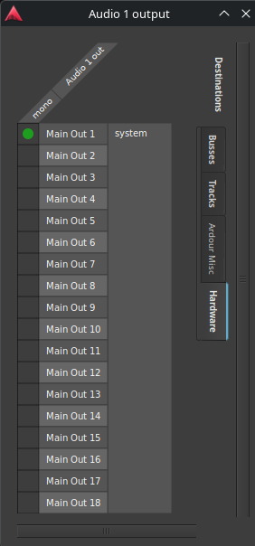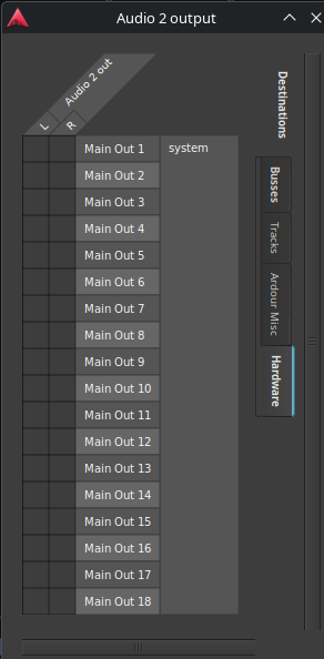 When I open the routing grid of the individual (mono) channels, I have access to my 18 USB outputs but my concern is related to the fact that my Ardour MONO tracks give me a L/R pair !
