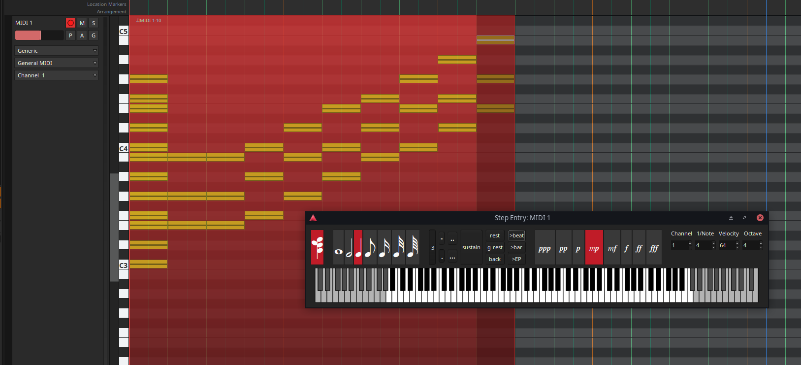 In chord mode, you can keep pressing keys on a MIDI keyboard, and after releasing the key, step-entry steps forward. This also allows for single notes in chord mode.