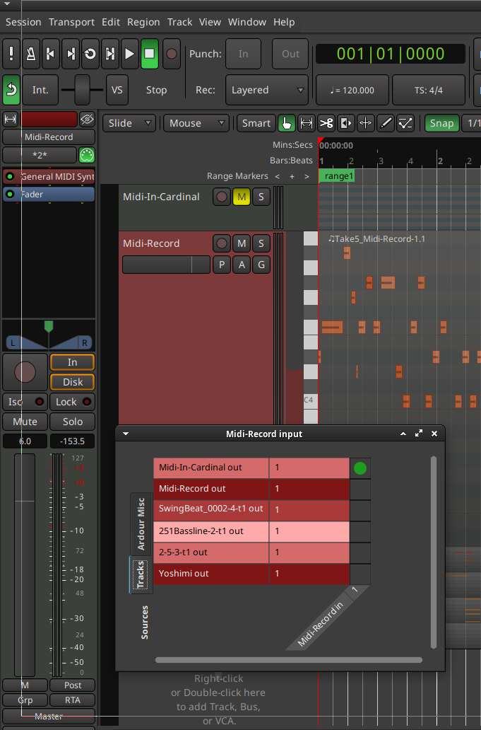 b) in ardour i created a second track and set the routing grid from the cardinal-midtrack output to the input of the miditrack itself.