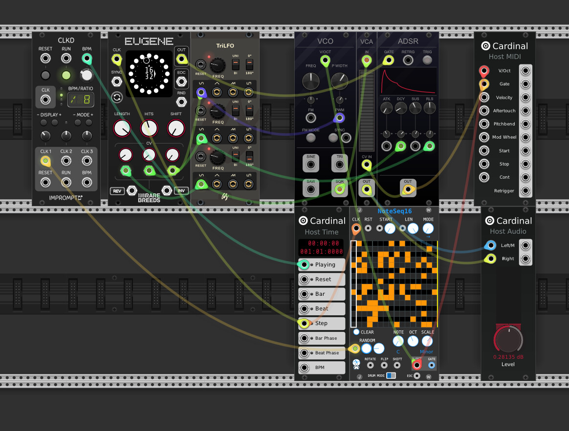 a) in cardinal i used Disthro modules “Host Audio” (so i can hear what cardinal produces) “Host Time” (so it is in time sync) and to capture the created midinotes “Host Midi”.