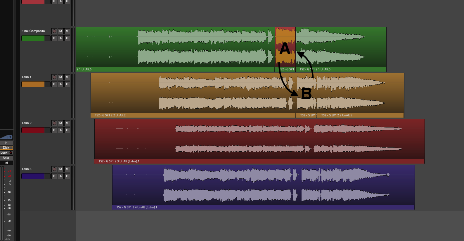 The part of the process that seems tedious is that all the takes are distributed across the timeline horizontally, rather than being readily available in track groups vertically like Reaper/Cohler. (https://www.youtube.com/watch?v=KOcHlpNeTkY) So I’ll be doing more copying/pasting from different points in the timeline, and unless I’m missing something, auditioning will be a bit more difficult.