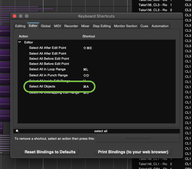 If I don’t have a track selected and use cmd-A, it selects all ‘objects’ (regions) across the project. But if I select an individual track first, then use cmd-A, it selects all in that track: