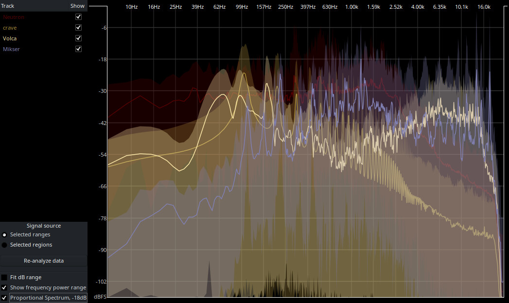 A dedicated perceptual analyzer window is now available within Ardour which allows one to visualize the live spectrum of multiple signals. A key feature is that one can overlay individual sources (tracks and busses) on top of each other. This allows one to see which track contributes a given of frequency range to the overall mix, find conflicting ranges or holes in the spectrum.