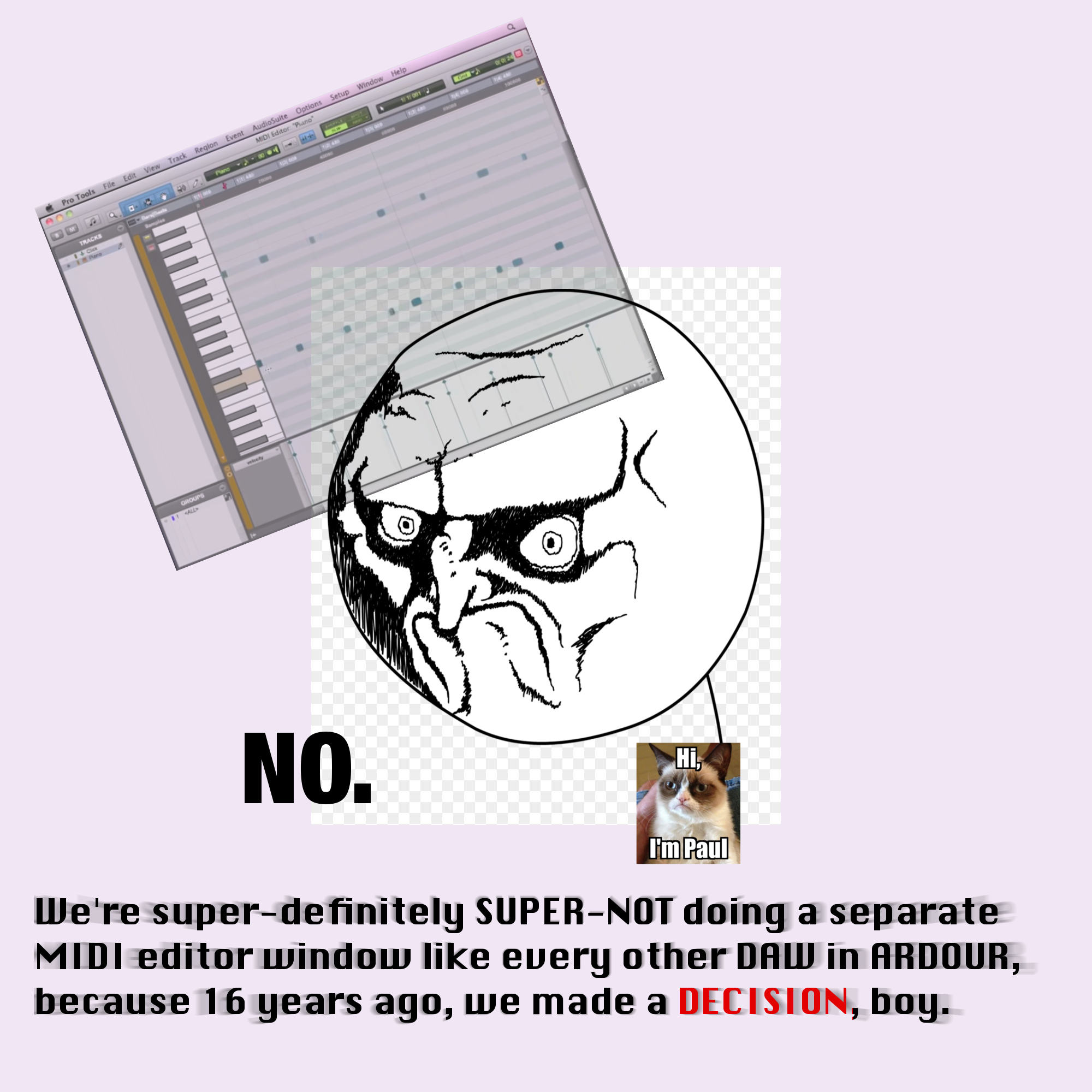 So it doesn’t matter at all what Pro Tools is doing (aside from the fact that it HAS a separate MIDI editor window), because Ardour won’t be used in the environments that Pro Tools already covers.