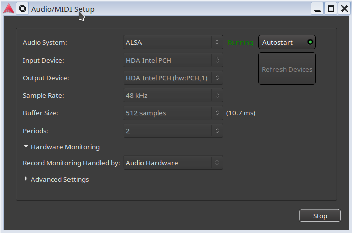 When you start Ardour and create a new session, it will normally ask you to select one, but you can change it at any time using the Window → Audio/MIDI Setup menu. You will get a window like this: