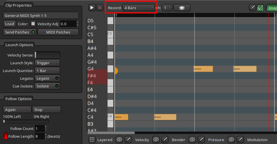 My confusion primarily stems from two places. First, I don’t understand the function of the Play and Record buttons in the Clip Properties section. I have not found any way yet to engage these directly. Second, even though I have changed the selection for “Record” to various settings, such as “4 bars”, “8 bars”, etc., this does not seem to impact how long is recorded. Instead, I seem to be consistently getting less than 1 bar of recording.