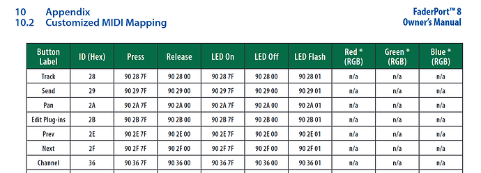 This is the excerpt of the data from the faderport 8 appendix on midi messages.